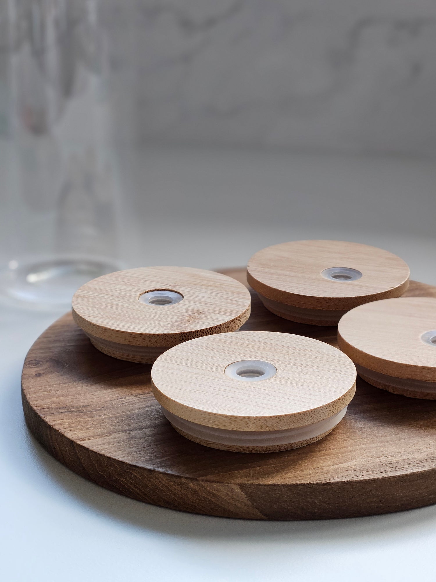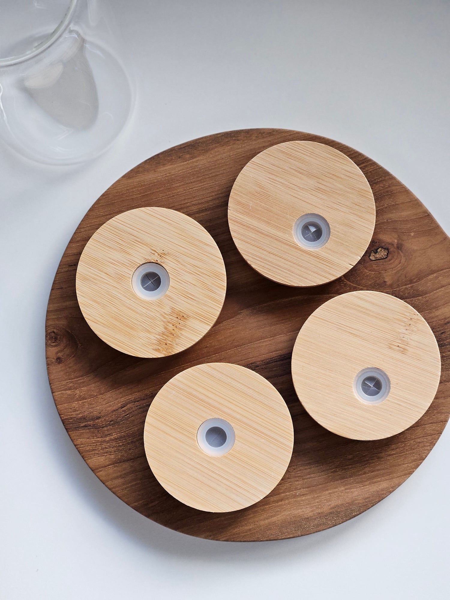 Chez Paper County, nous proposons des couvercles en bambou assortis à nos tasses en verre, à la fois élégants et respectueux de l’environnement. Deux styles sont disponibles : un avec un trou pour paille au centre et un autre avec un trou légèrement décalé.