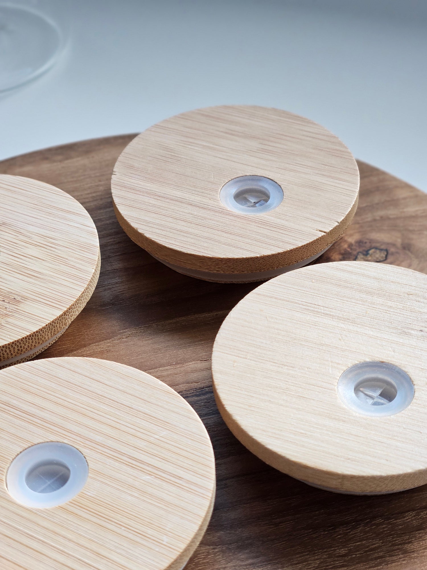Couvercles en Bambou :Associez votre tasse en verre à nos couvercles en bambou naturel. Écologiques et pratiques, ils permettent de garder vos boissons en sécurité, que vous soyez à votre bureau ou en déplacement (découvrez-les ci-dessous!).
