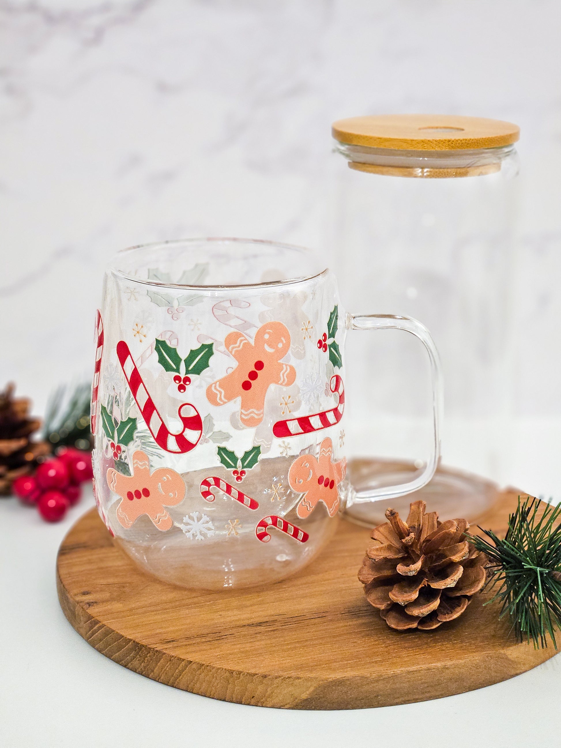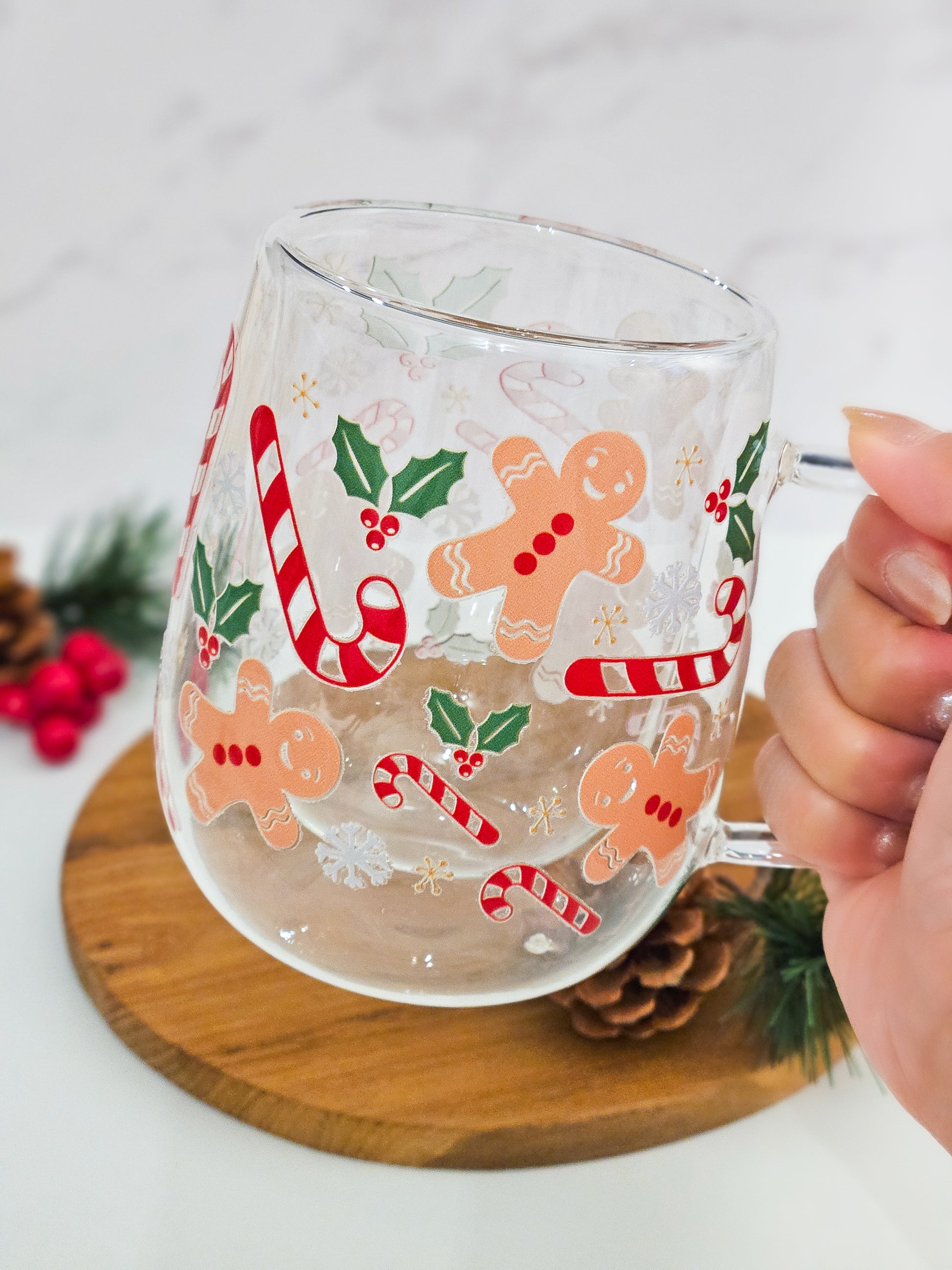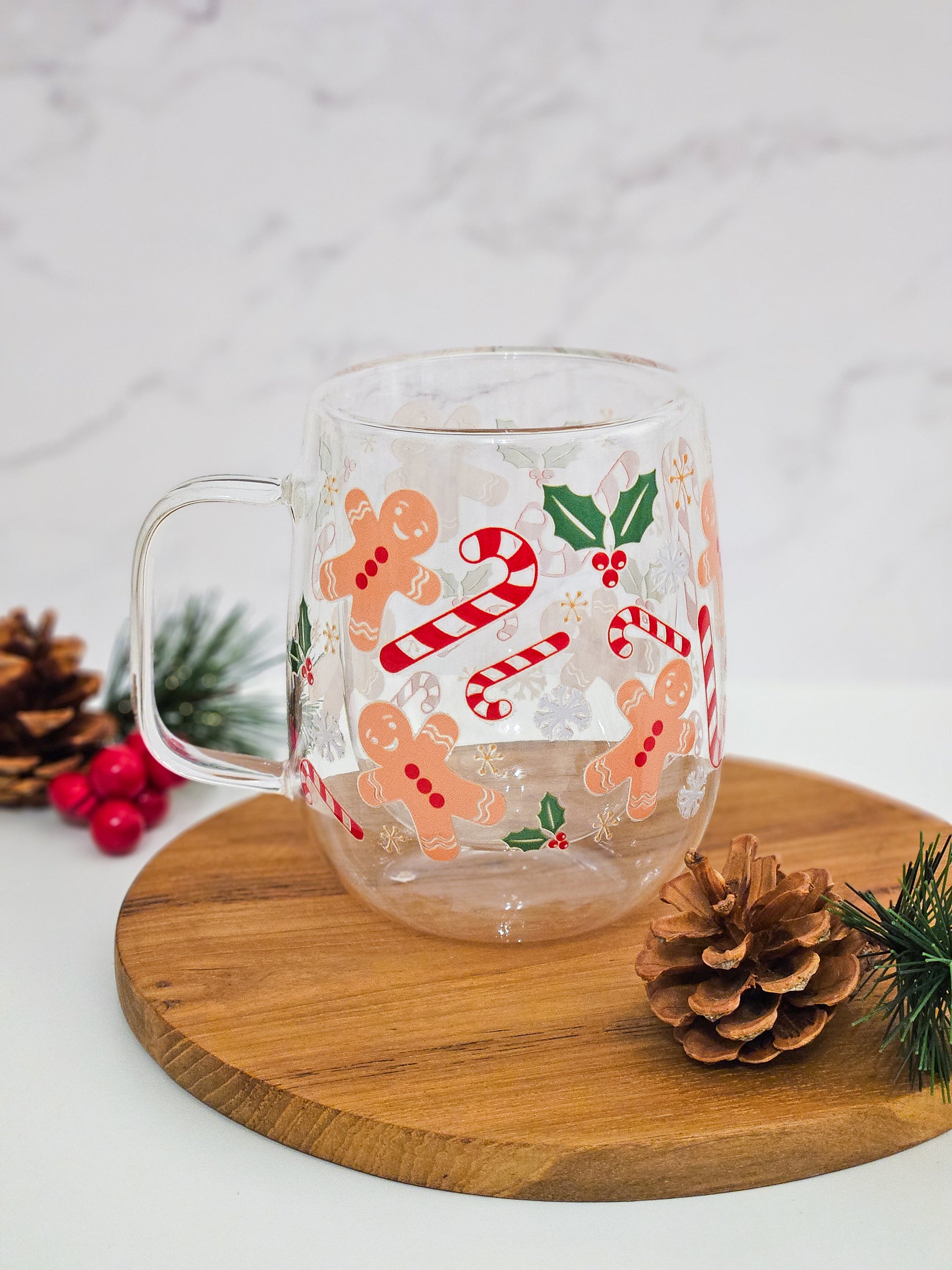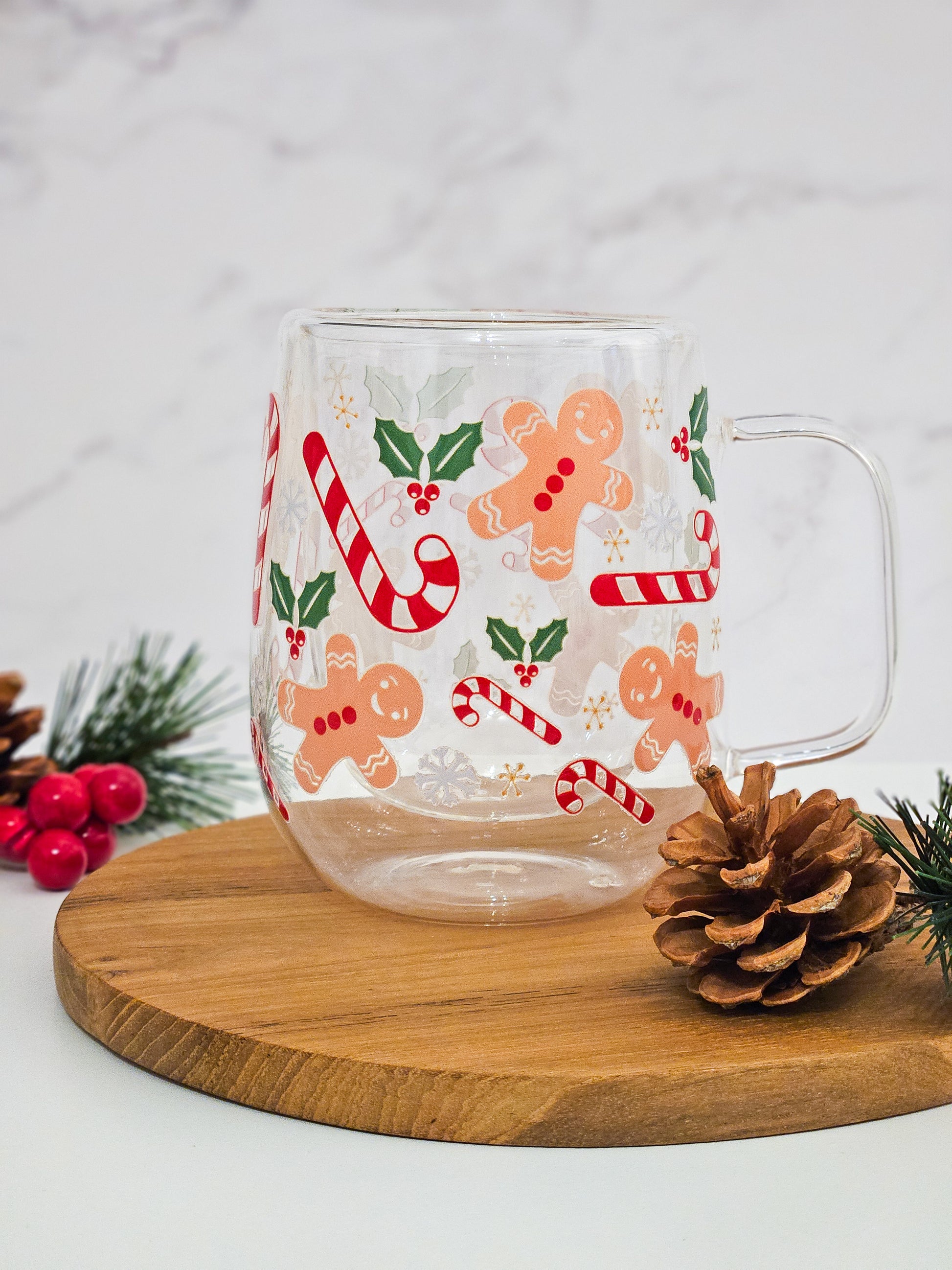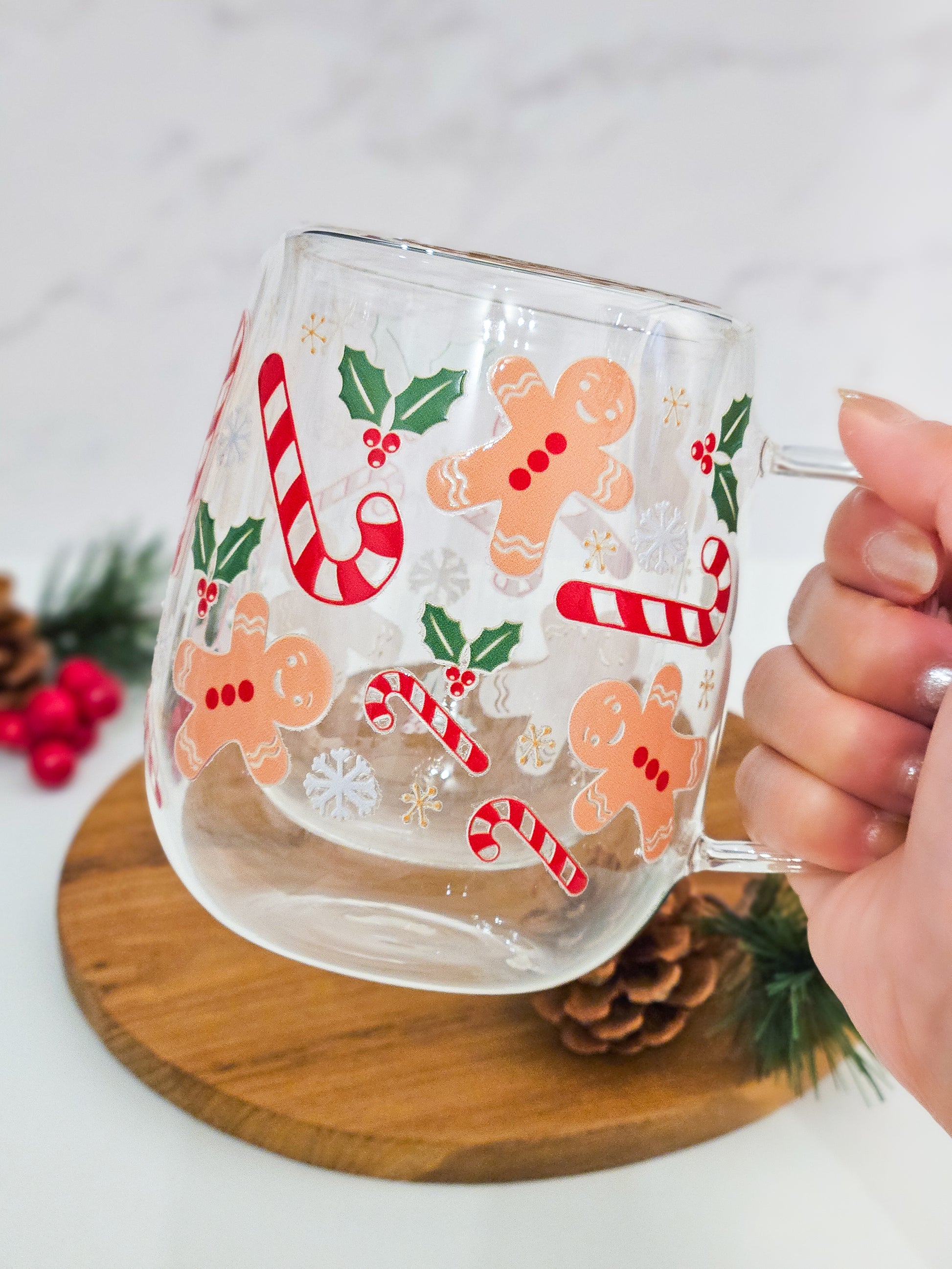 Fait main avec amour, ce mug en verre à double paroi Gingerbread Man est fabriqué en verre borosilicate durable—plus léger et plus résistant que le verre ordinaire. Sa conception à double paroi garde votre boisson chaude plus longtemps tout en restant agréable au toucher, et son anse offre un confort supplémentaire. Décoré avec un motif joyeux de cannes en sucre et de pain d’épice pour la saison, il est à la fois pratique et charmant.