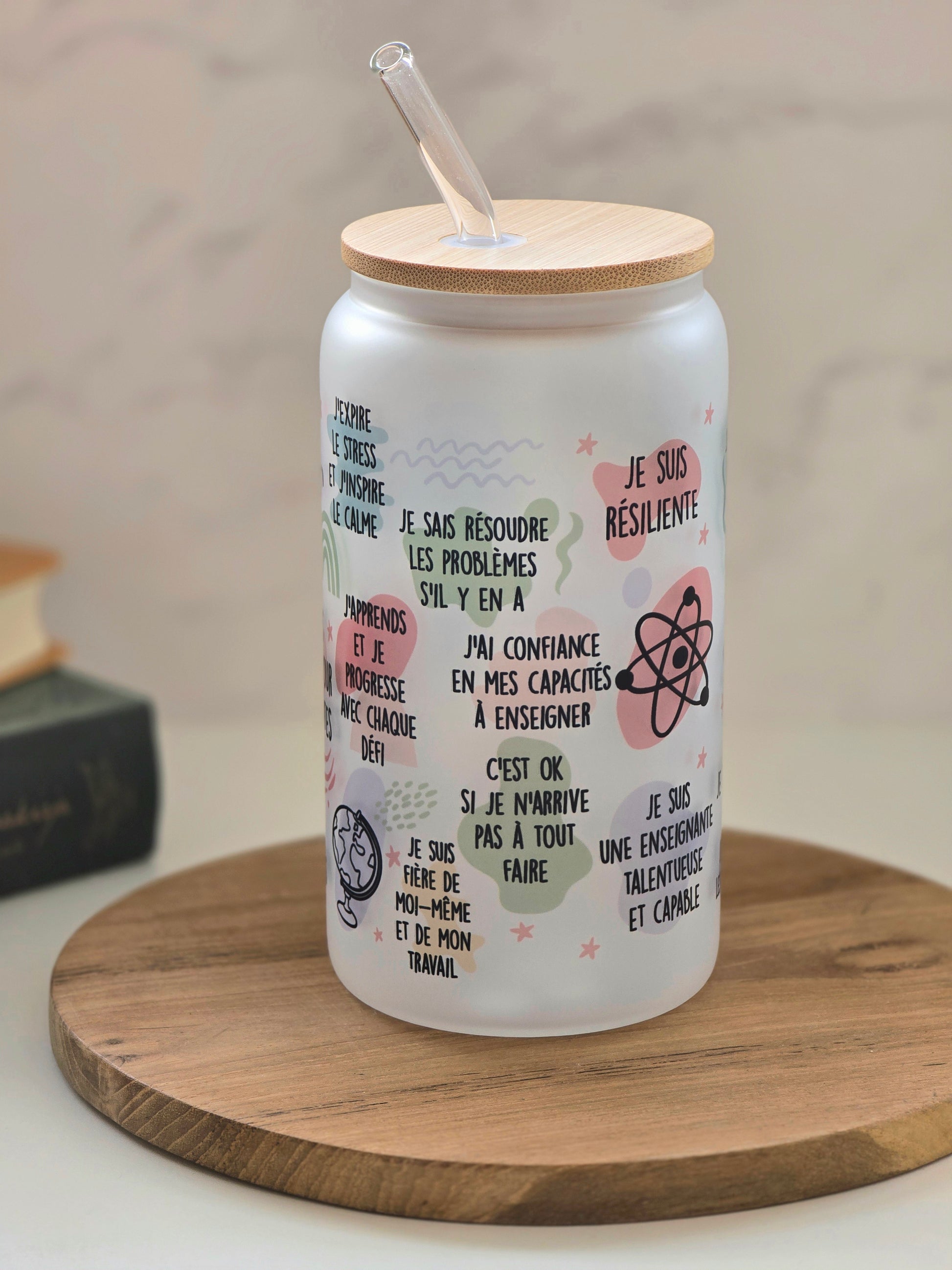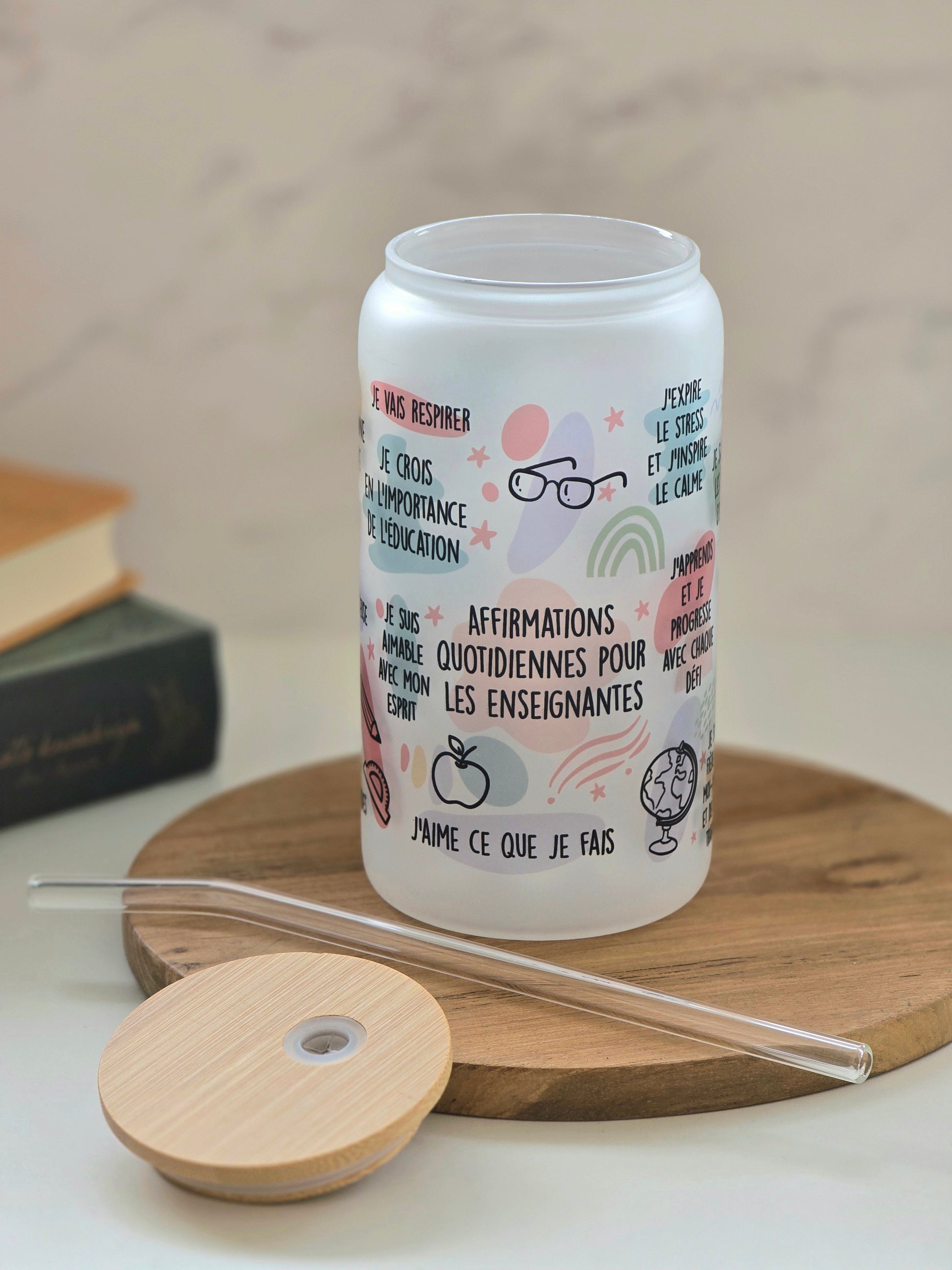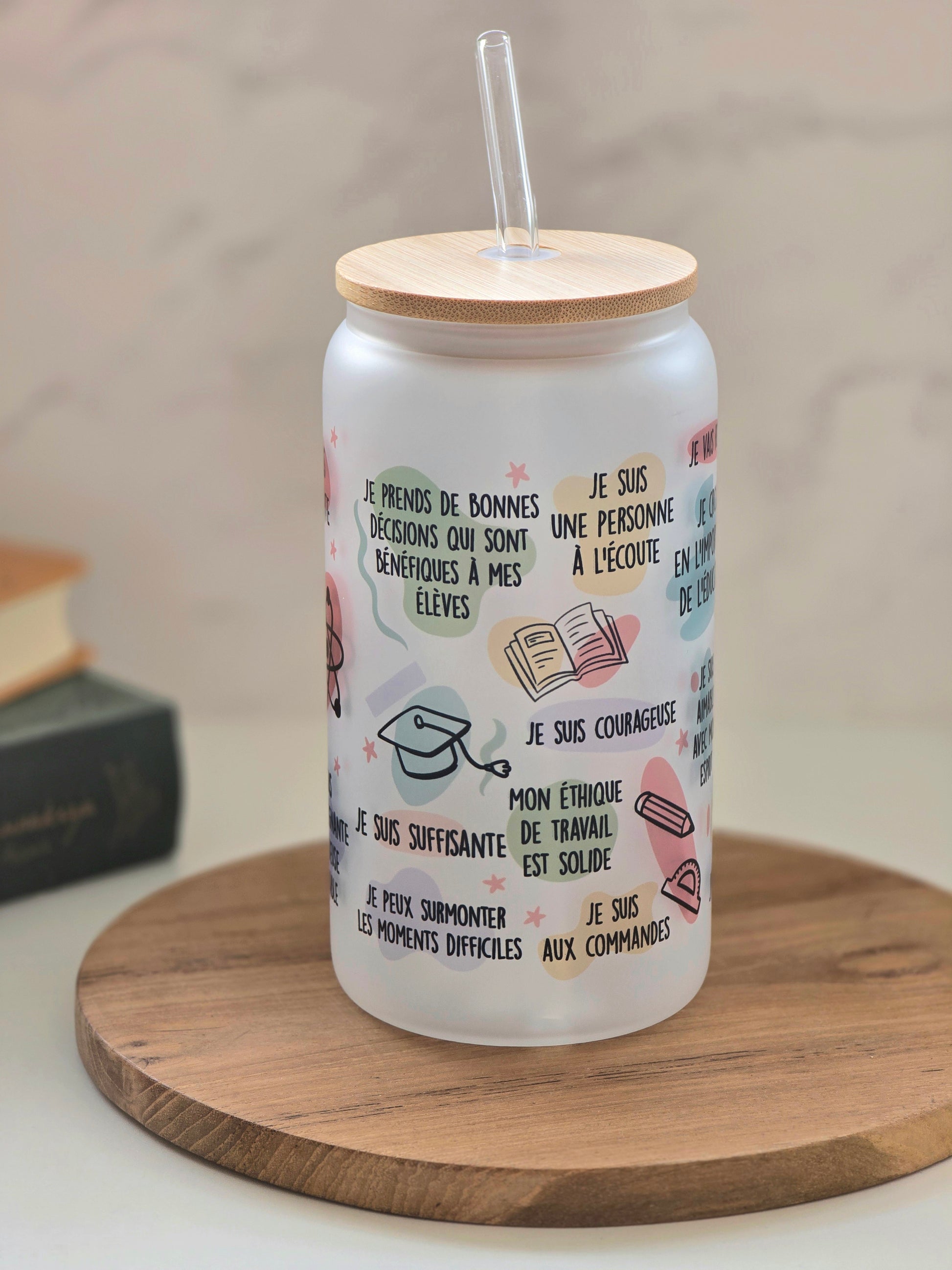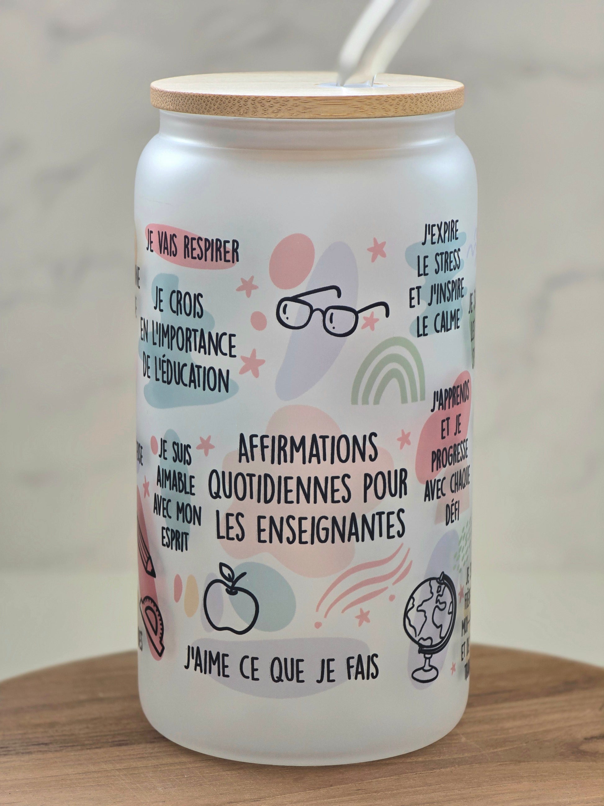Handcrafted with care, this Affirmations Quotidiennes pour les Enseignantes – Sublimation style glass cup is designed to celebrate and uplift teachers with every drink.