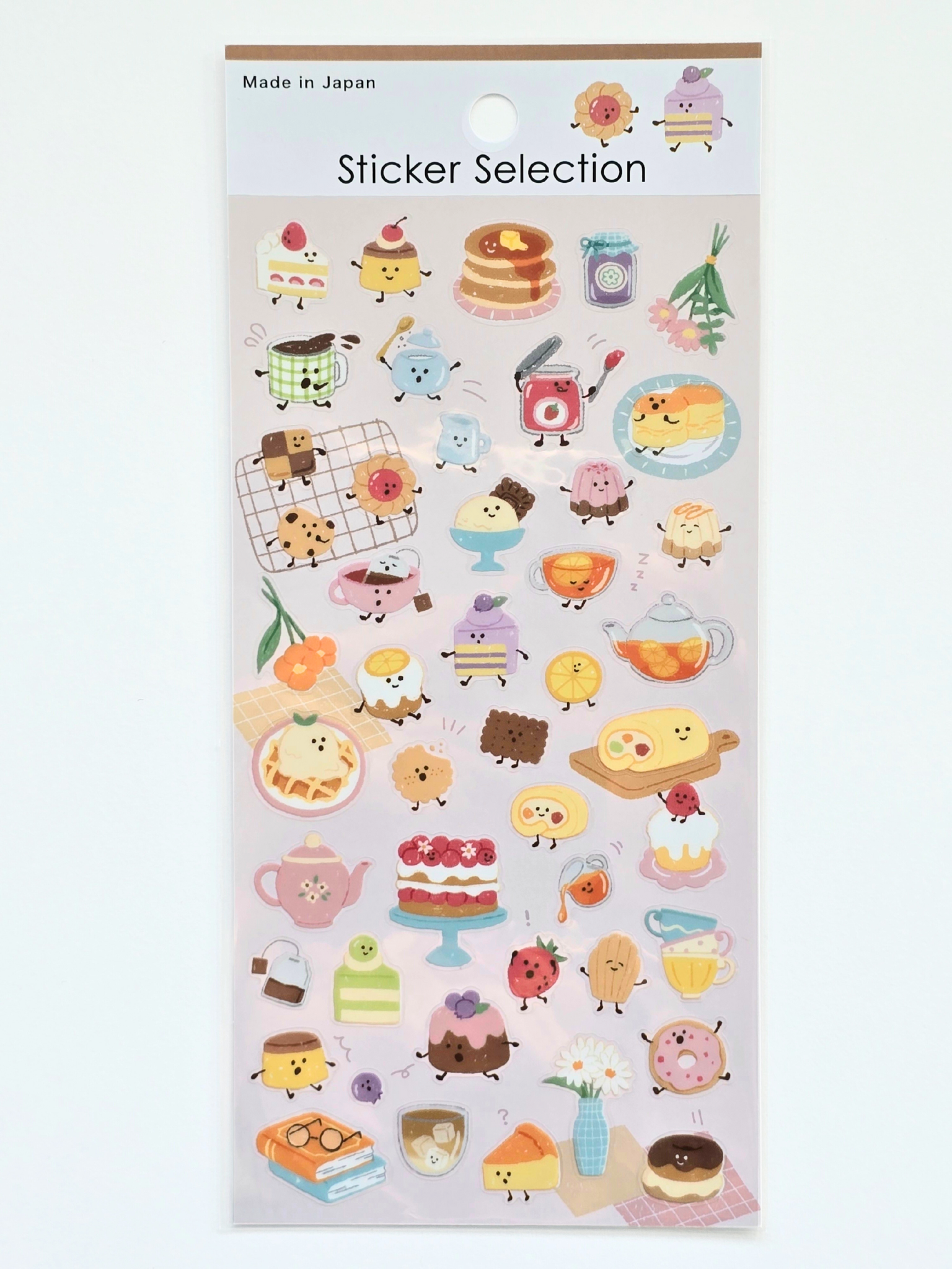 A sheet of cute dessert and sweets stickers featuring cakes, pastries, and drinks with playful character designs—great for decorating notebooks, planners, or letters.