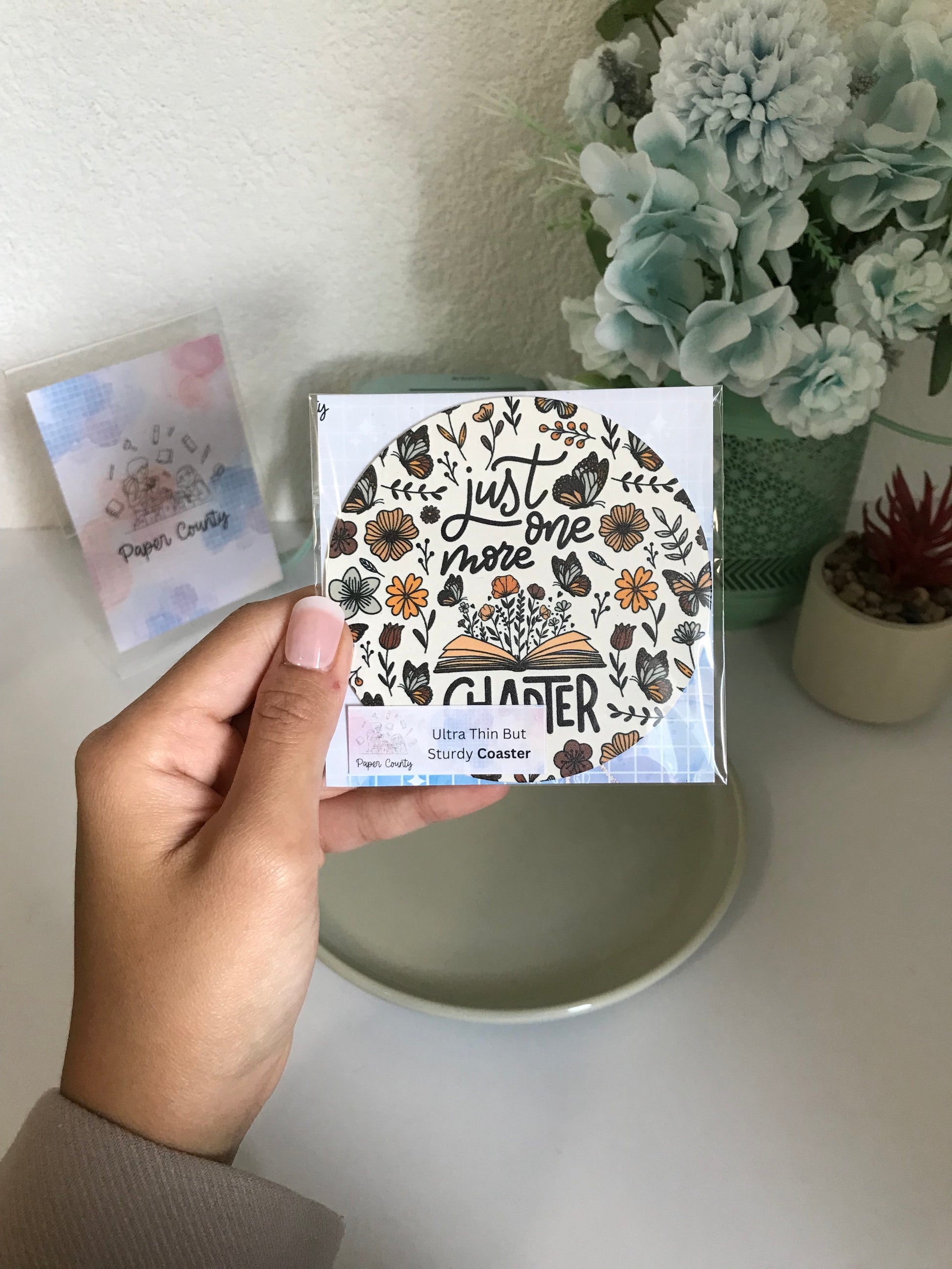 Our 'Just One More Chapter' coaster is printed in full color on a thick, premium coaster board — a perfect fall addition for book lovers who adore autumn.