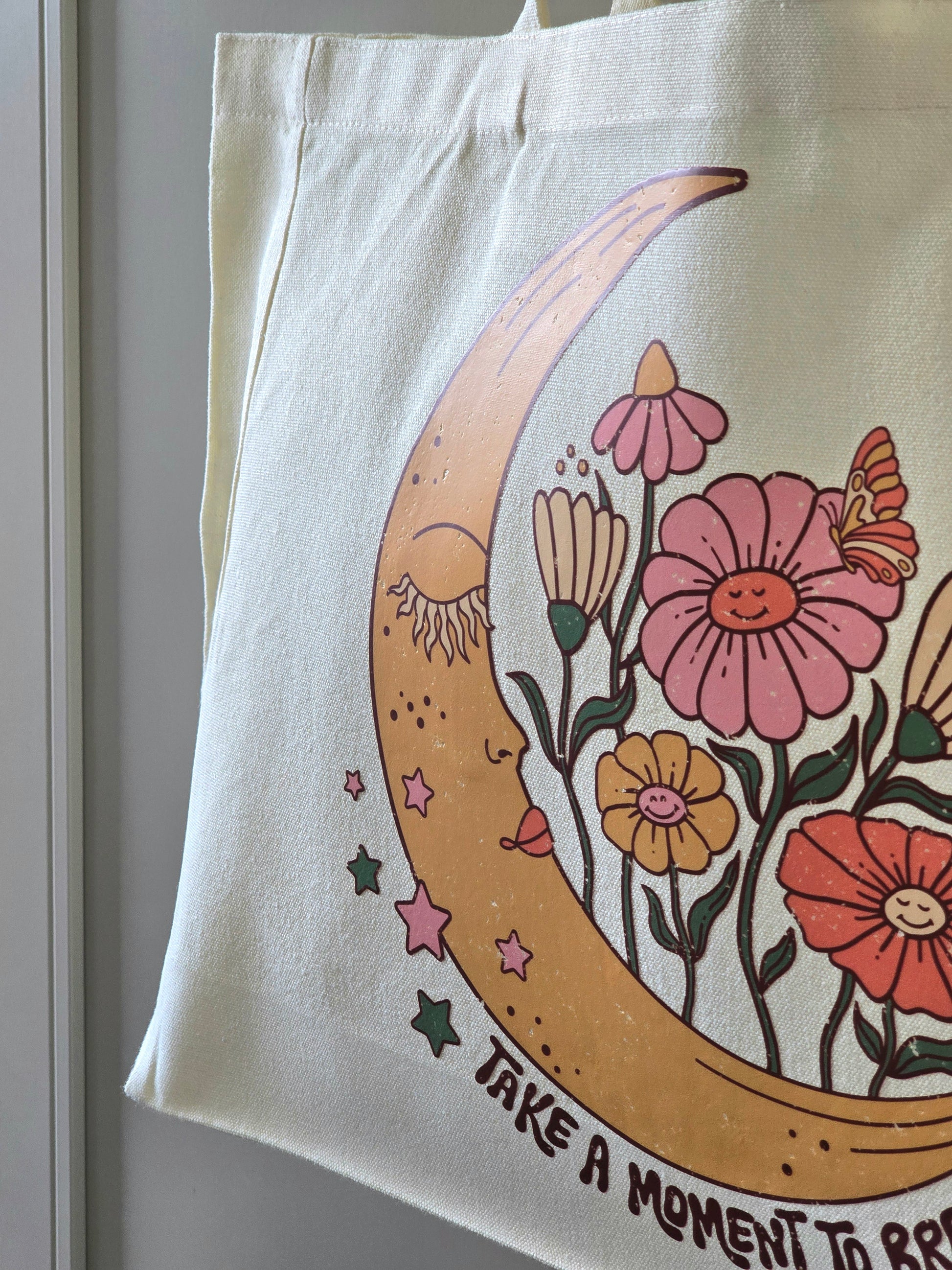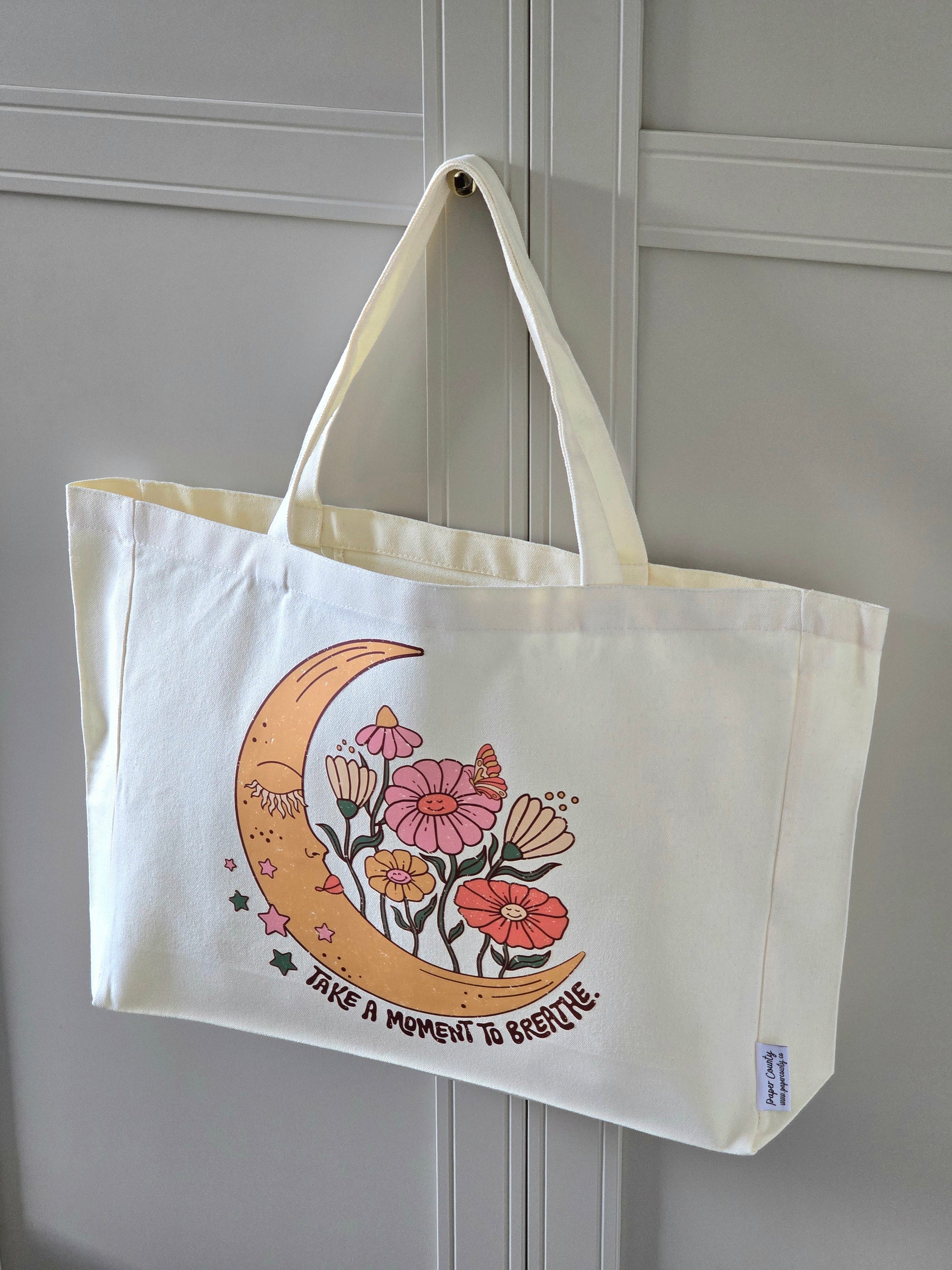 This 'Take a Moment to Breathe' tote bag is a gentle reminder to slow down and find calm in your day. The phrase encourages you to take a break, breathe deeply, and reset when life feels overwhelming.